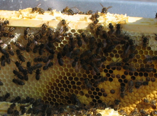 Dabei ketten sich die Bienen aneinander, und bauen die Waben von oben nach unten. Ein frisch