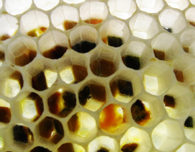 Das von den Bienen erbaute Wachs ist erst reinweis, und verfärbt sich durch den Kontakt zu den Bienen, Honig und